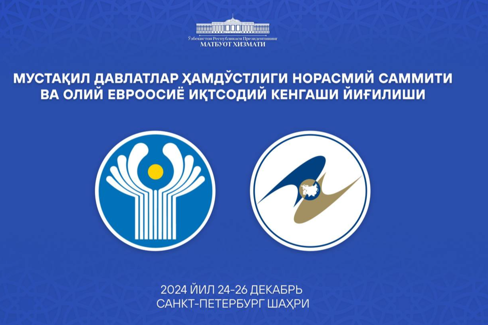 Ўзбекистон президенти Шавкат Мирзиёев 25-26 декабрь кунлари Россия Федерацияси президенти Владимир Путиннинг таклифига биноан Санкт-Петербург шаҳрида бўлиб ўтадиган Мустақил Давлатлар Ҳамдўстлиги (МДҲ) ва Евроосиё иқтисодий иттифоқи (ЕОИИ) саммитларида иштирок этади.